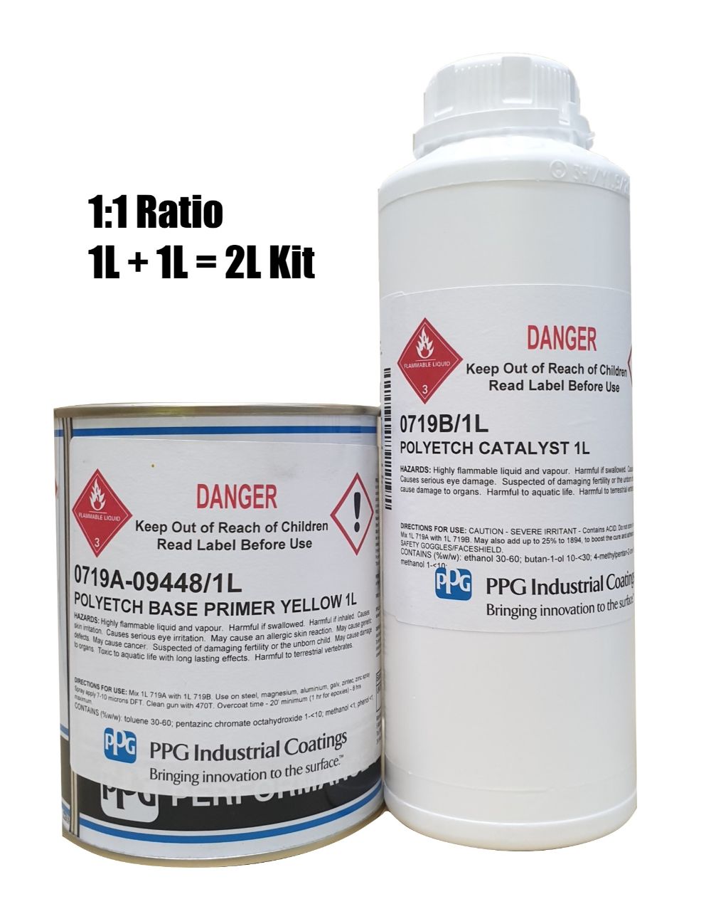 719 Polyetch is a top of the range, two-pack, anticorrosive self-etching primer. It is based on vinyl / butyral / phenolic resins and zinc tetroxy-chromate pigment. The catalyst contains phosphoric acid.